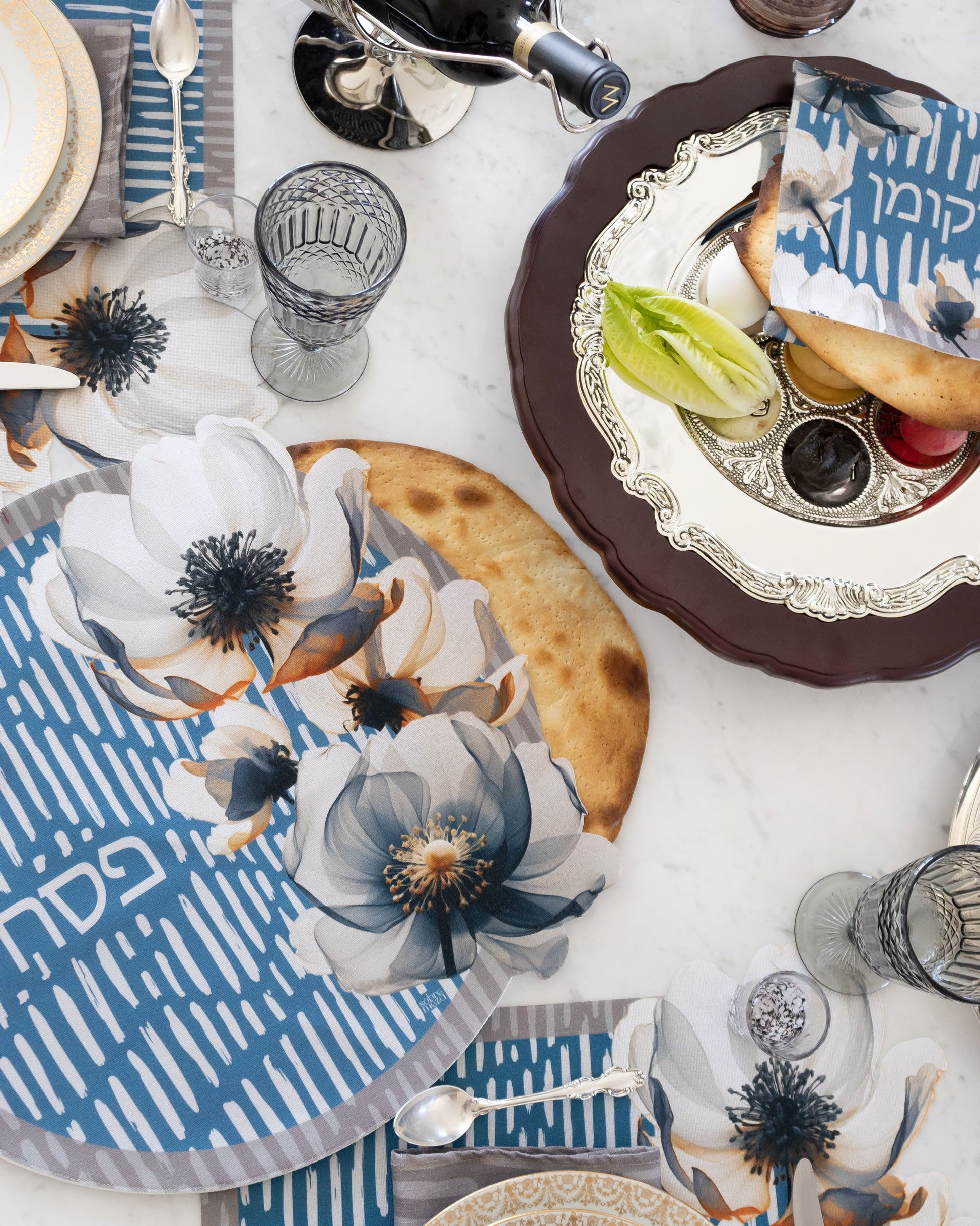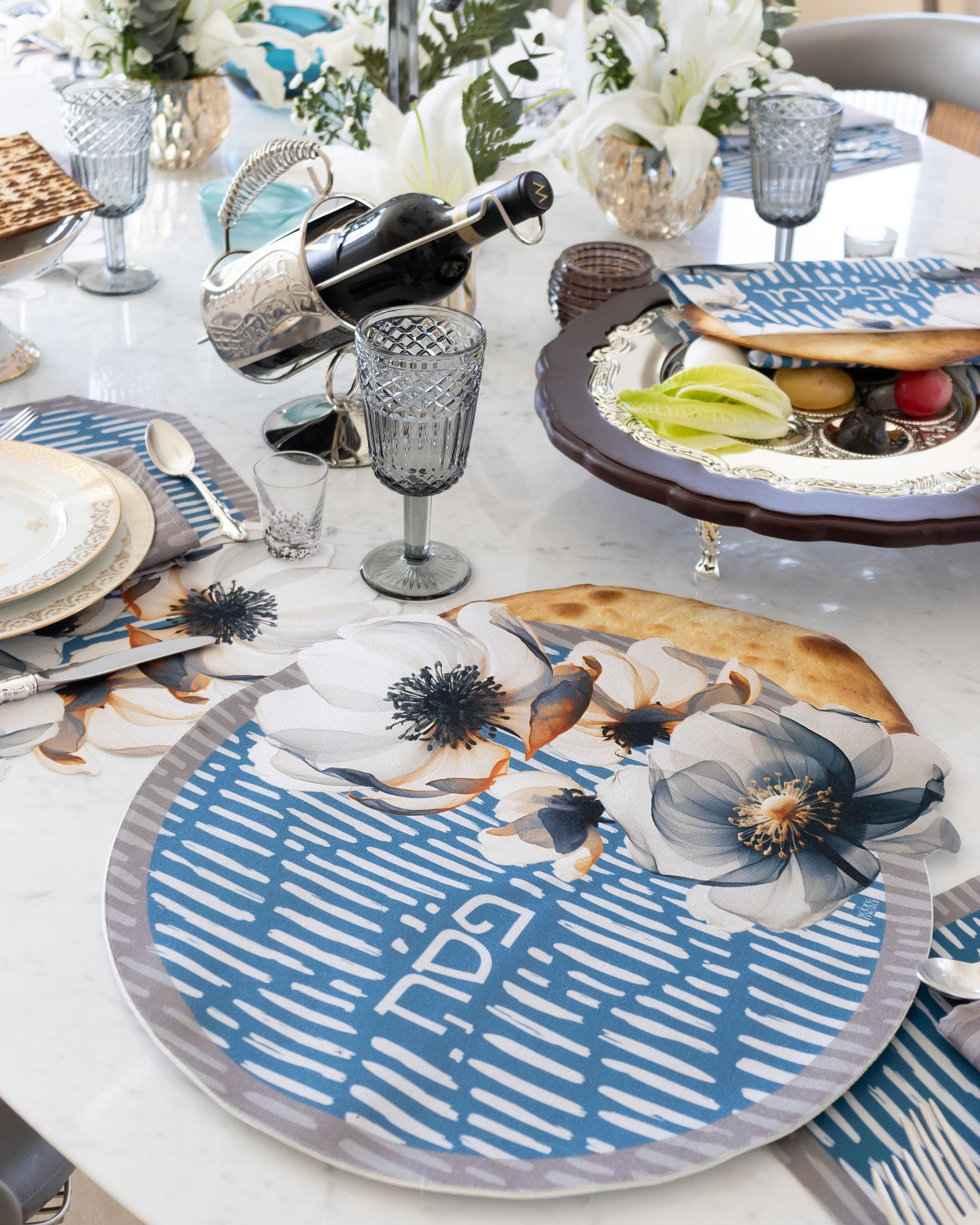 Elegant Passover Essentials. Nude blooms grace this Matzah cover & Afikoman bag set, elevating your Seder table in style. 17-inch spill-proof Matzah case, perfect for round Shmurah Matzos or square Matzahs. With three fabric pockets, it securely stacks the three Matzohs. The matching spill-proof Afikoman bag, sized at 9.75 x 7.5 inches.