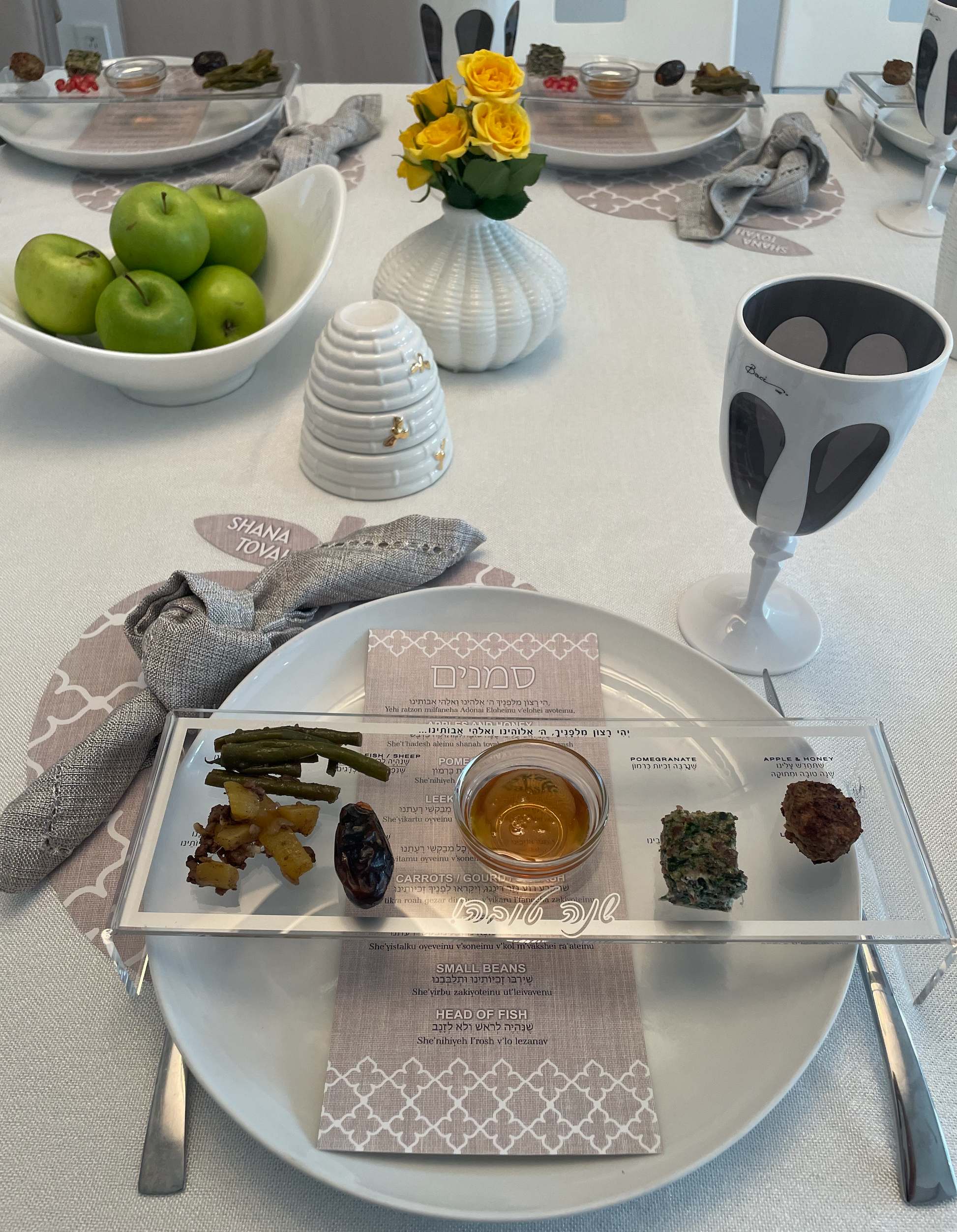 Add a touch of elegance to your Rosh Hashanah table with this exquisite ornamental apple set. Featuring a beautifully crafted decorative apple that symbolizes a sweet new year, this set also includes matching prayer cards, making it a meaningful and stylish addition to your holiday celebrations. Perfect as a centerpiece or as accents throughout your table, this set will help create a warm, festive atmosphere for your guests