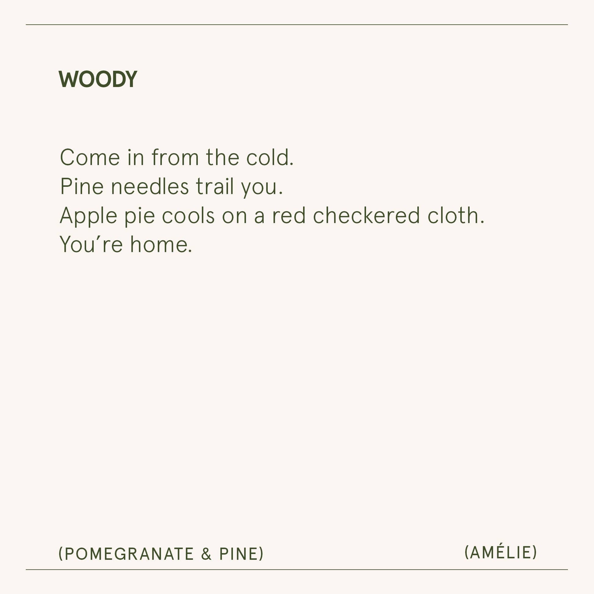 Spicy, woody, and sweet. Pine and pomegranate are the unlikely duo you soon won’t want to live without. For those cool mornings, golden afternoons, or crisp evenings, this deep and fruity fragrance provides comfort and pure calm.